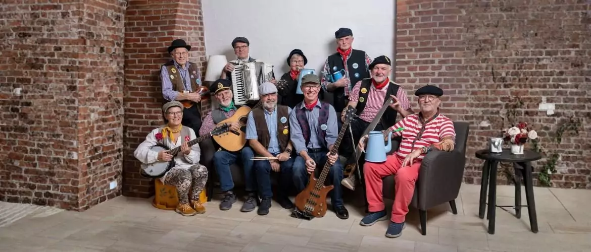 Med alt fra harmonika og violin til vaskebræt og kaffekande skaber de en stemning af varme og fællesskab, hvor publikum inviteres til at synge med på kendte og elskede sange.